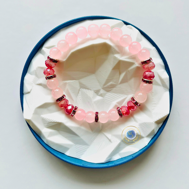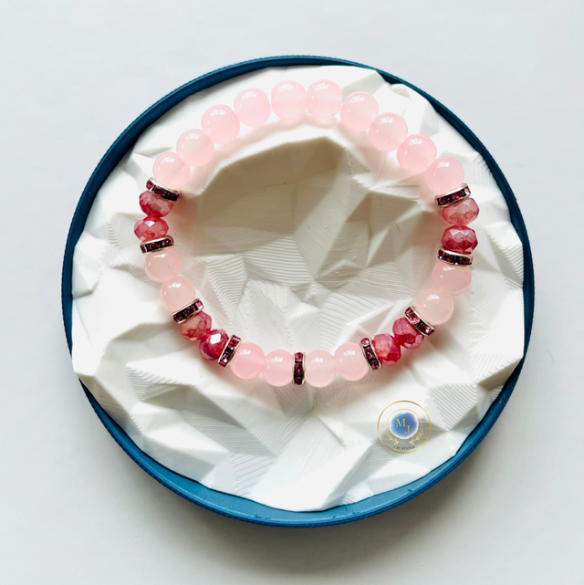 De armband is handgeweven met matte rozenkwarts kralen, glanzende fuchsia facetkralen en glinsterende roze strass-spacers die een subtiel contrast creëren. Deze armband is perfect voor een romantische touch bij elke outfit, of als liefdevol cadeau voor iemand die jouw hart raakt.