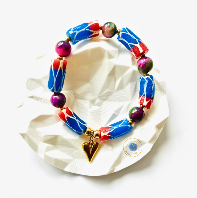 Laat je stijl spreken met deze unieke armband die kunst, kleur en symboliek combineert in één prachtig sieraad. De handbeschilderde kralen in diepblauw met rood en wit maken elk exemplaar net een beetje anders, terwijl de glanzende paarse en groene accenten zorgen voor een speels, modern contrast.