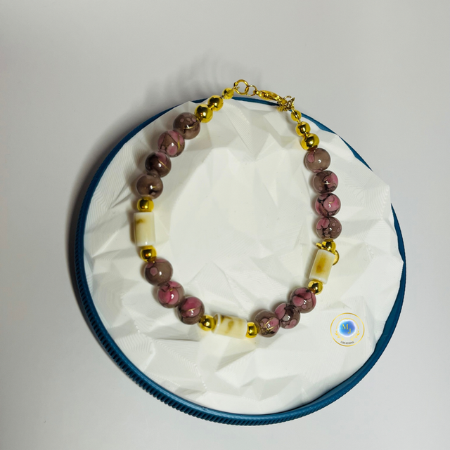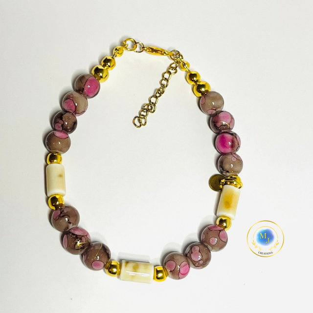 Deze elegante handgemaakte armband van MJ Creations combineert zachte roze marmerlook kralen met warme crèmekleurige kralen en glanzende goudkleurige accenten. Het kleurenspel geeft de armband een vrouwelijke, chique en tijdloze uitstraling.