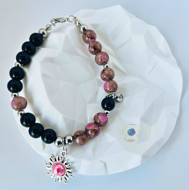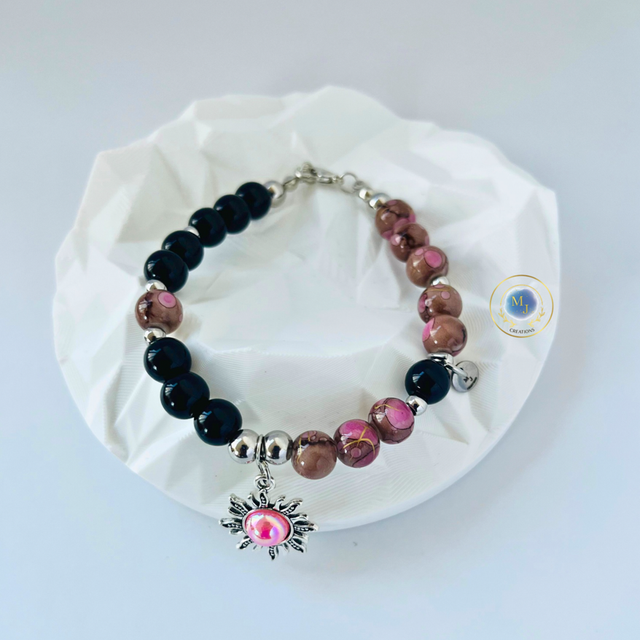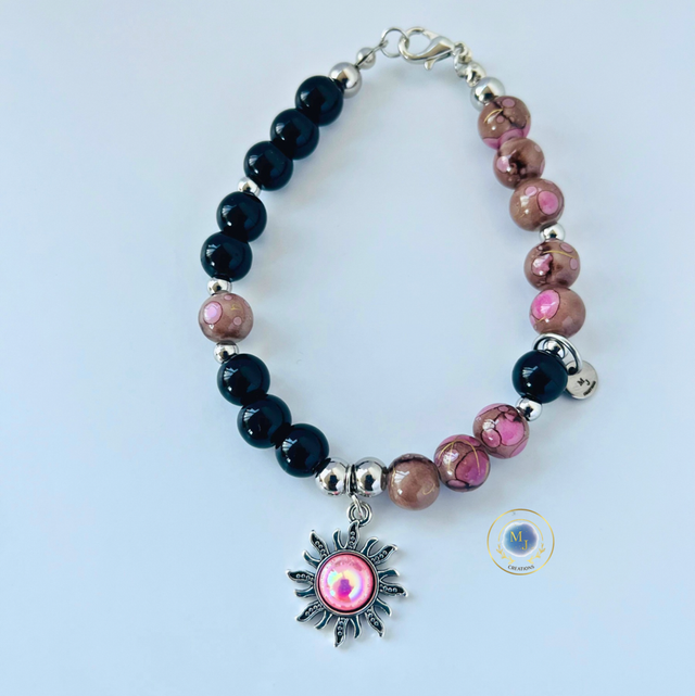 Deze elegante handgemaakte armband van MJ Creations combineert diepe zwarte kralen met warme roze marmerlook kralen, wat zorgt voor een krachtige maar vrouwelijke uitstraling. In het midden hangt een verfijnde zonnebedel met een roze glanzend accent, symbool voor energie, kracht en positiviteit.