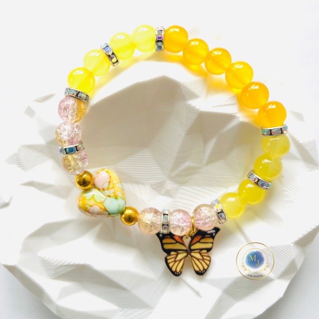Deze handgemaakte armbanden set van MJ Creations brengt direct een zonnig gevoel. De warme gele glaskralen stralen positiviteit en energie uit en worden subtiel gecombineerd met verfijnde details voor een elegante afwerking.