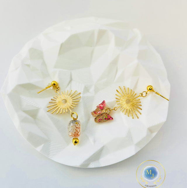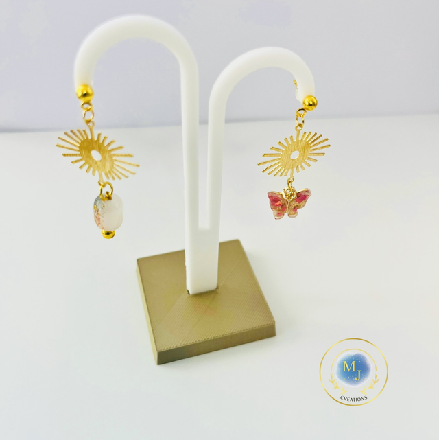 Deze handgemaakte oorbellen van MJ Creations stralen vrolijkheid, elegantie en een vleugje speelsheid uit. De goudkleurige zonvormige elementen zorgen voor een warme, zomerse uitstraling, terwijl de vlinder een verfijnd en vrouwelijk accent toevoegt. De natuurstenen hanger geeft het ontwerp een natuurlijke en unieke touch.