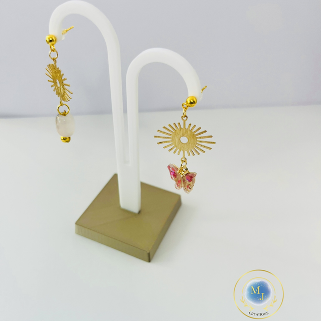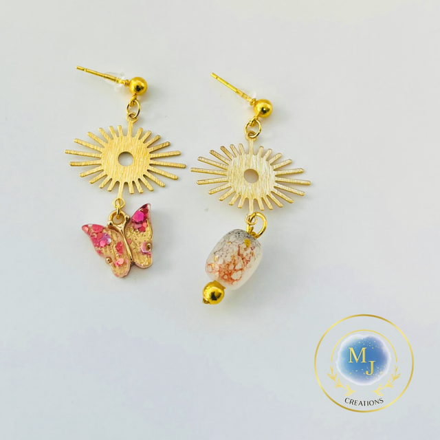 Handgemaakte Goudkleurige Oorbellen met Zon, Vlinder & Natuursteen