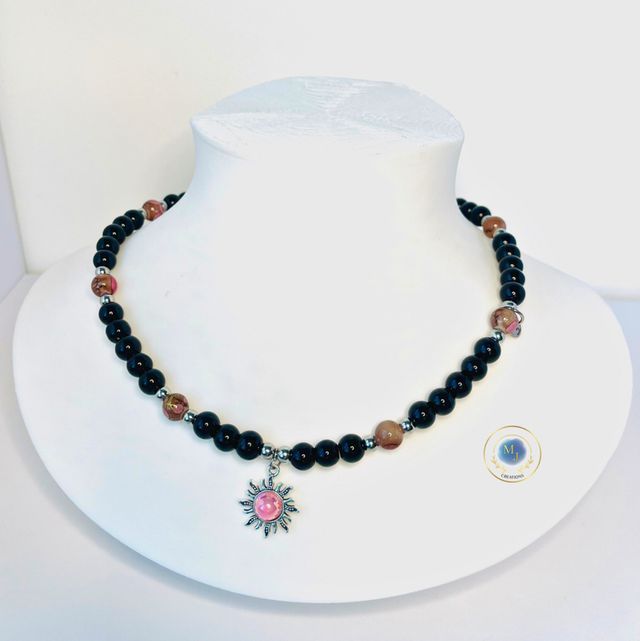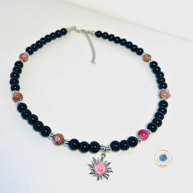 Deze handgemaakte ketting van MJ Creations combineert een stoere uitstraling met een subtiel warm detail. De diepzwarte kralen vormen een elegante en tijdloze basis, terwijl de zonvormige bedel met roze accent zorgt voor een zacht en speels contrast.