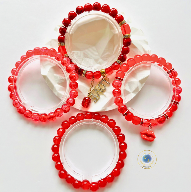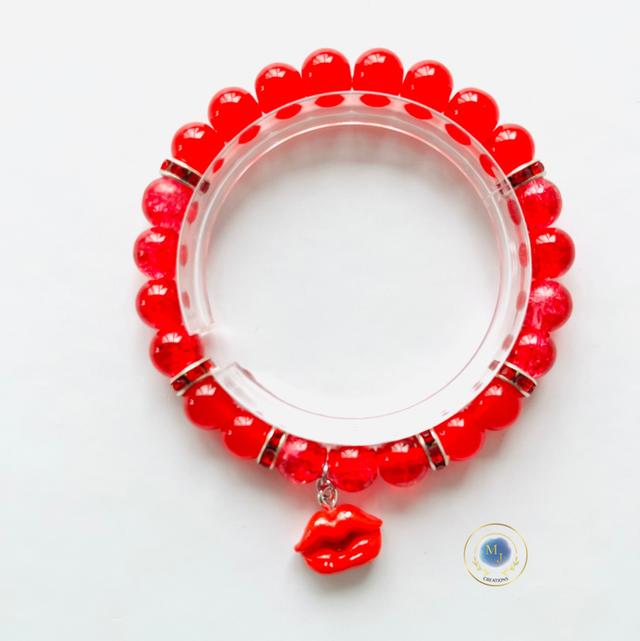 Deze handgemaakte armbanden set van MJ Creations is ontworpen voor wie durft op te vallen. De diepe rode glaskralen geven de set een krachtige en luxe uitstraling. De speelse bedels, waaronder een lips-detail en een statement hanger, zorgen voor een unieke en vrouwelijke finishing touch.