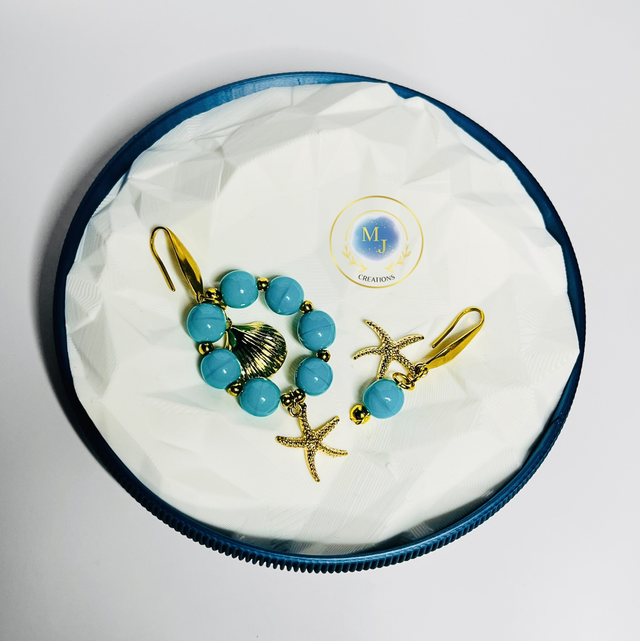 Deze handgemaakte oorbellen van MJ Creations brengen direct een zomers en elegant gevoel. De frisse turquoise kralen vormen samen een speelse cirkel en worden prachtig gecombineerd met een goudkleurige zeester en een subtiel schelpdetail.