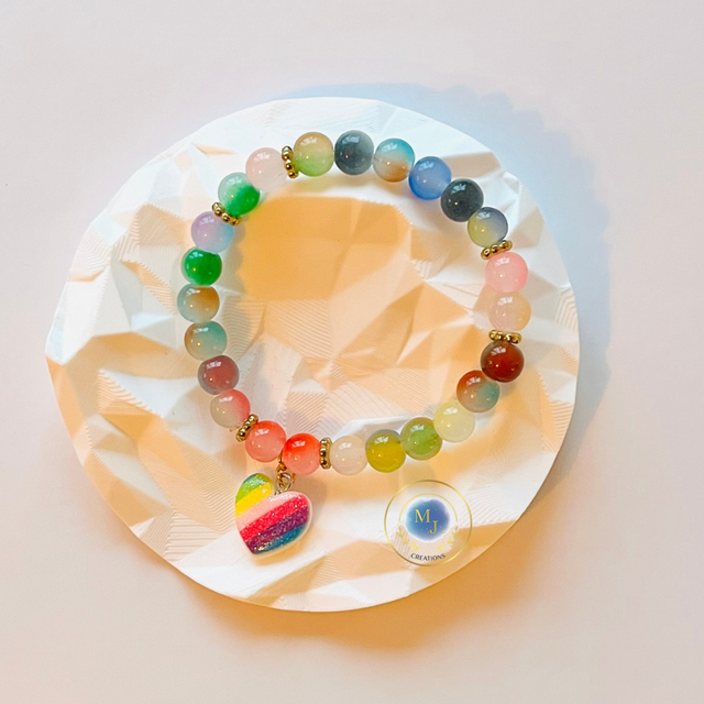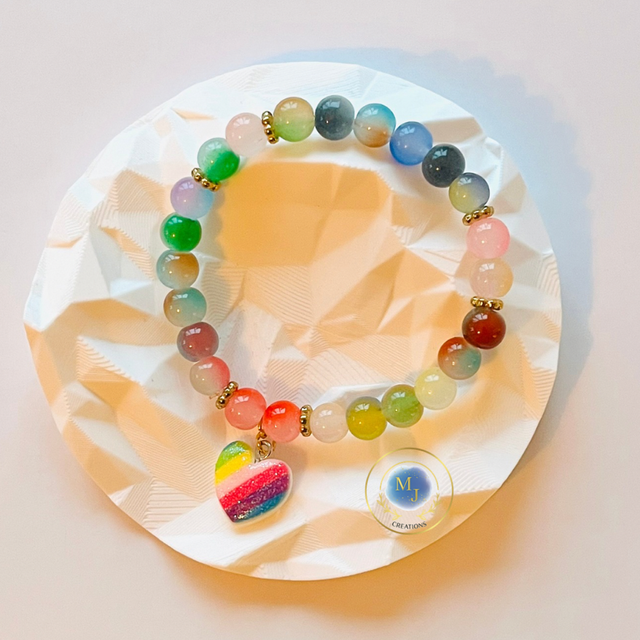 Een armband die straalt van liefde, kleur en vrolijkheid! Gemaakt met kralen in zachte regenboogtinten en afgewerkt met een speelse hartvormige hanger in heldere kleuren. Het perfecte accessoire voor wie wil opvallen, een boodschap wil uitdragen of gewoon blij wil worden van kleur.